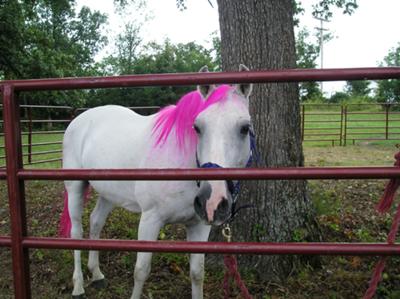 Amber sent us this picture of her horse Sugar. She dyed her hair pink for Halloween. Isn't she cute? Share your comments on Amber's page. Let Amber know what you think of Sugar! A Great Horse Show StoryWe love the horse stories you have shared with us. There are so many it's hard to pick just one, but this one was funny...Halley from Devon told this great story about a girl who hit a horse and started Horse Mayhem! Read it and let Halley know what you think! Horse Movie: The Long ShotHave you seen the movie The Long Shot? I've watched it lots of times on DVD. It's about a woman who has a dressage horse that she is training for a competition. She desperately needs to win. But then the horse goes blind. What does she do???