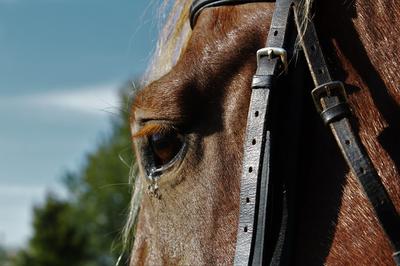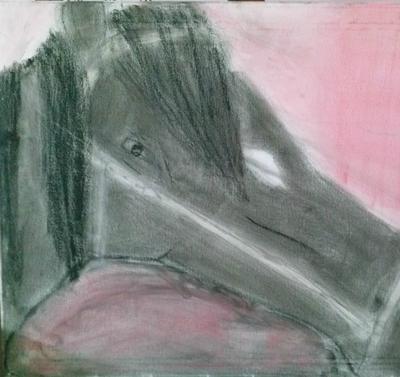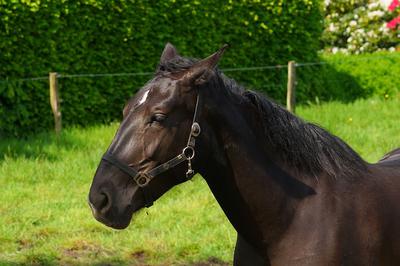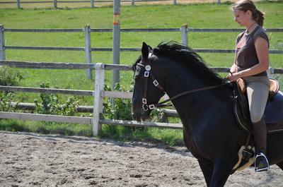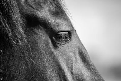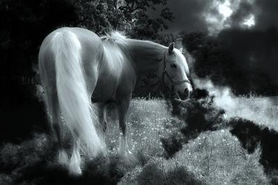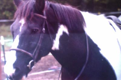 A loud kick jerked me from my musing. The woman was now leading a black horse, dirty and wild looking from the trailer. The whites of his eyes were showing and his ears were laid back.