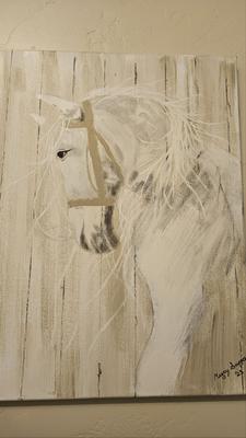 Here is a horse painting that I did several years ago. I call it the Snow Angel Stallion. First I made the wood effect on the canvas, and then sketched the horse with a pencil on top of that. I was looking at a painting online that my mom found to kinda get the idea of what I was going after but of course, mine didn't turn out exactly the same. After I had drawn the horse onto the canvas, I added the paint. I wanted it to have a stroked mystical look, so that is why some of the horse is kind of faded out of the picture. I added several different colors to the painting to give it detail.